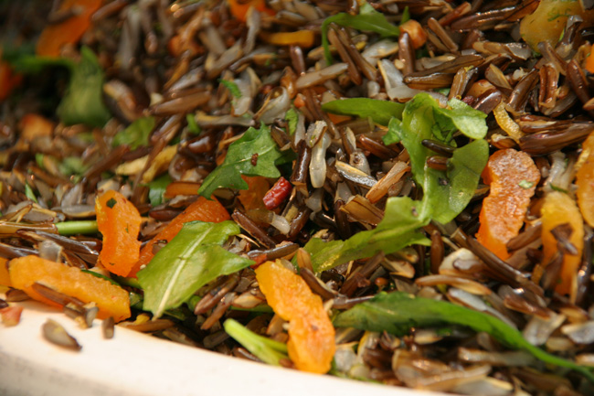 On occasions like these I fall back on a tried and tested formula with large bowls of yummy food for us all to dig into and this time the sunshine inspired a Greek-ish menu: slow cooked lamb shoulder with a wonderful piece of Laverstoke Park Farm meat studded with loads of rosemary and garlic was cooked slowly for over 5 hours so that it really did fall off the bone. I matched that with tabbouleh, tzatziki and flatbreads. The tabbouleh was Ottolenghi’s, and the tzatziki was one that I saw on Australian Masterchef from George Calombaris. It simply tastes better with the lemon zest and the moisture drained from the cucumber. The final main dish was adapted from another Ottolenghi recipe: Wild Rice Salad.