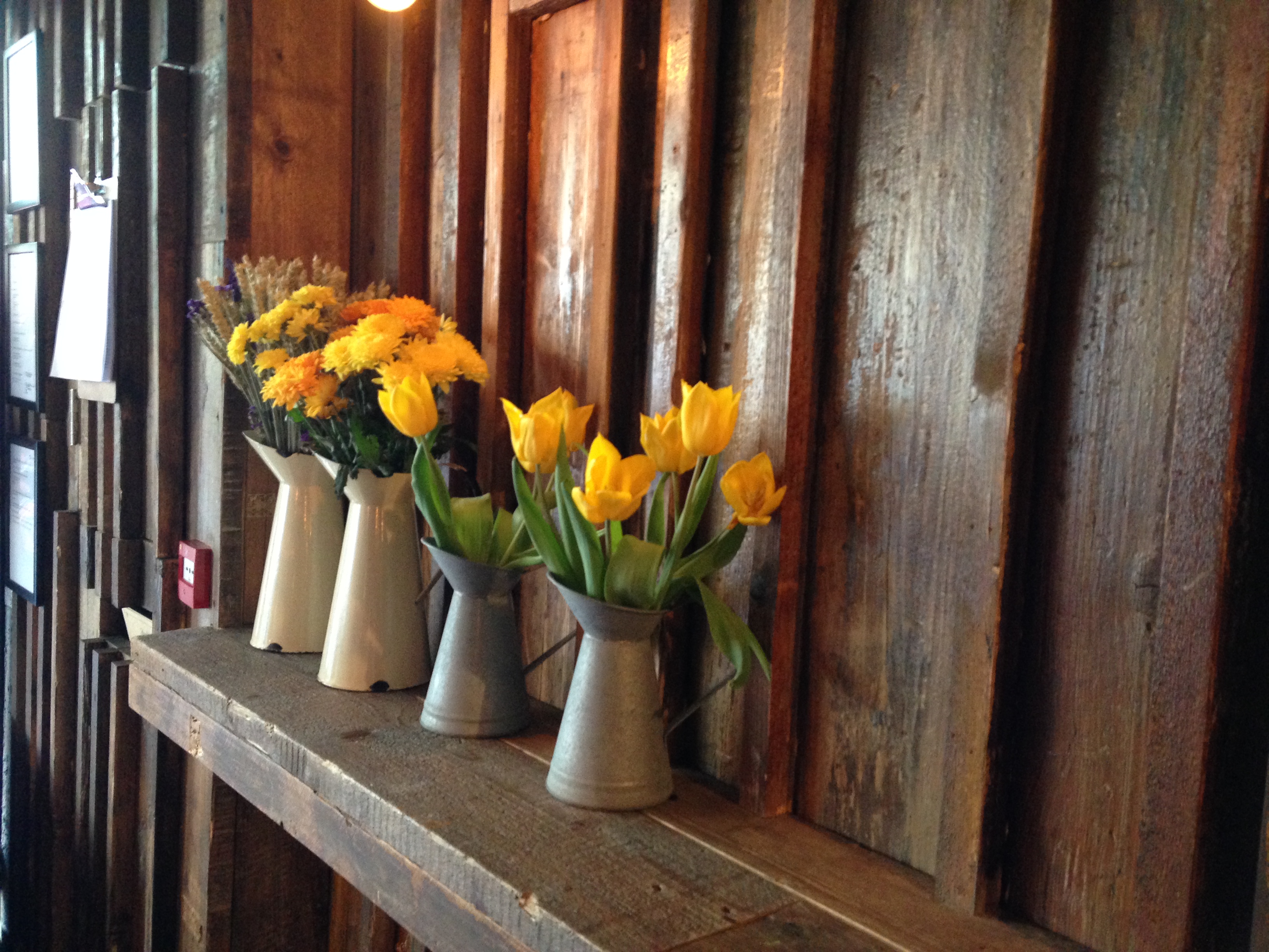 It seems the whole industrial look has overstayed its welcome. We seem to think that trendy means not so comfy and my barstool was in much the same vein as those at Grain Store. The walls are all corrugated metal and open brickwork. The lights are the trendy green New York look. My wait gave me time to take in the Barnyard styling and I could imagine the many meetings that had taken place choosing not only the signature menu items but also the decor. Picket fencing, enamelware and galvanised metal were the order of the day with the staff in ho-down style checked red shirts. So far so farmyard.